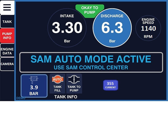 In auto mode the pump controller serves as a reference for the operator. It includes the master intake and discharge pressure as well as the status of the tank fill and tank to pump valves. The operator does not need to use the pump controller for anything directly. The tabs are still active on the left side of the screen for the operator to view the pump info, video (if installed) and engine data.