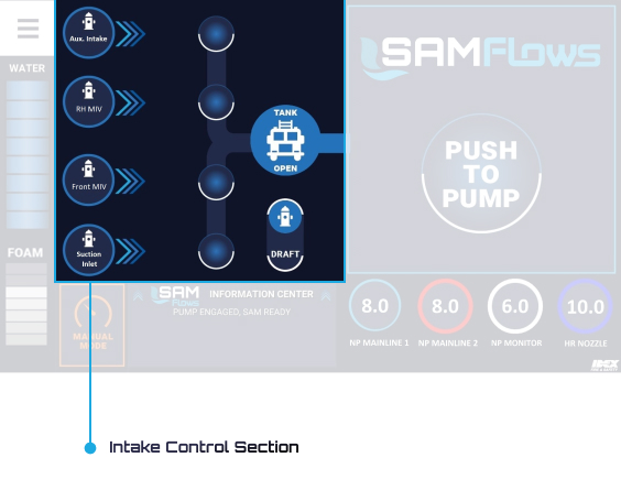 This is where you’ll see all of your available intakes on the vehicle. They can all be opened and closed right here by swiping the intake right or left. This section will always show where your water is coming from and if you’re running from your tank or from one of the intakes.