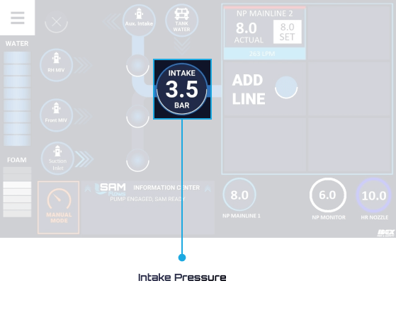 When running from hydrant or draft, the master intake pressure is shown in the center of the intake section. When running from a pressurized source and the intake pressure drops too low, SAMFlows will send an audible alarm, letting the operator know that there is low intake pressure. SAMFlows will not increase the engine speed any more to prevent the intake hose from collapsing and the pump from cavitating.
